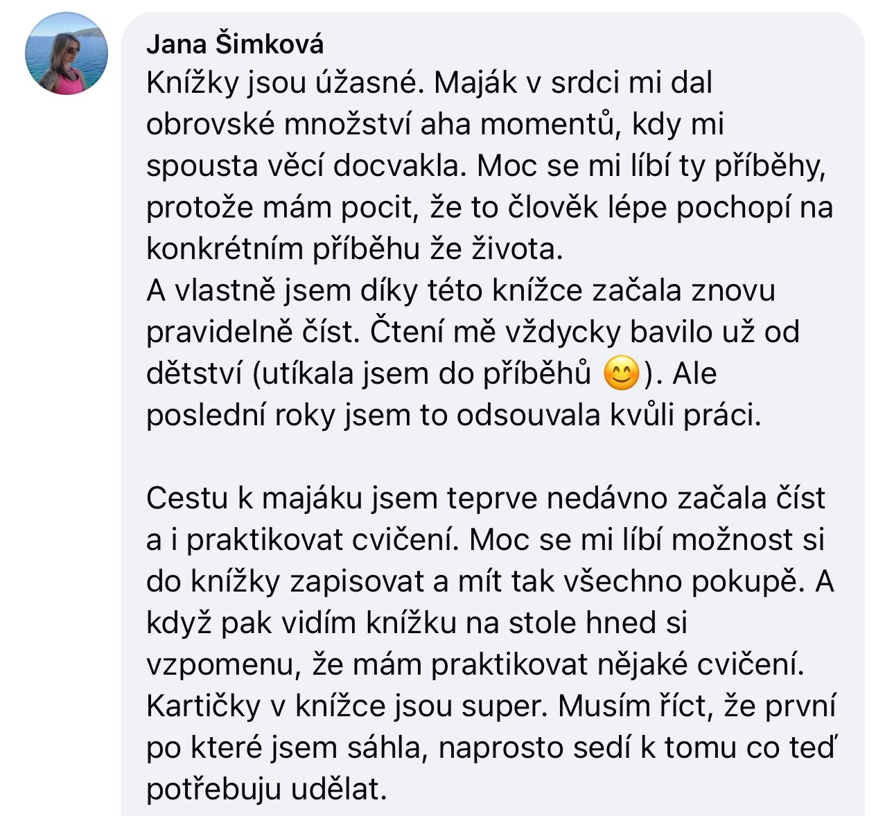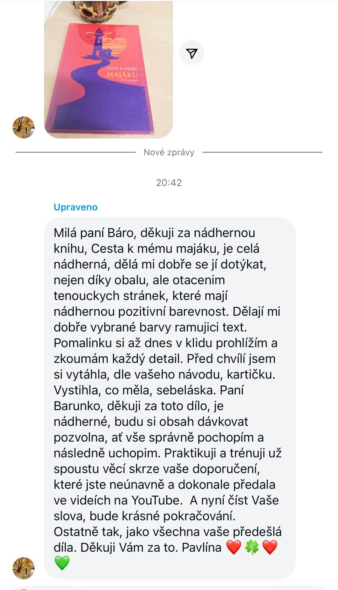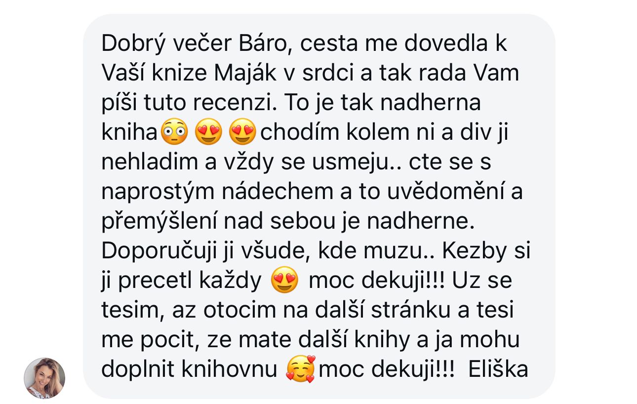 Cesta k mému majáku je CESTA. Je to reálná a velmi intenzivní možnost, díky které po jednotlivých krůčcích opravdu změníte svoje energetické pole a začnete vědomě skládat puzzle svého vytouženého života. Bára opět nezklamala, její knihy jsou jako hvězdy, díky kterým vidíte pod své nohy i když kolem zuří bouře neprospěšností všedních dní. Knihu doporučuji a věřím, že navede mnohé k tomu, co jsem zažíval já. K podstatě, k ryzosti a lásce v každém konání. Děkuji.."