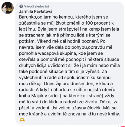 Když jsem začala pořádat vědomé kempy, myslela jsem, že budu inspirovat lidi k nalezení klíče k jejich problémům, ale začaly se dít zázraky mnohem větší. V kolektivní energii a rituálních kruzích se lidská nitra otvírají rychleji a silněji, odkládají své strasti a bolesti přímo na místě kempu. Lidé, kteří přijíždějí se sklopenou hlavou, zakřiknutí, s léta nesenými traumaty, odjíždějí narovnaní, s úsměvem, probuzení ve své opravdové síle a autenticitě. Pokud chcete vykročit z komfortní zóny do léčivé energie, která tvoří zázraky, přijďte – já tam budu, zda vy, to je otázka pro vás.